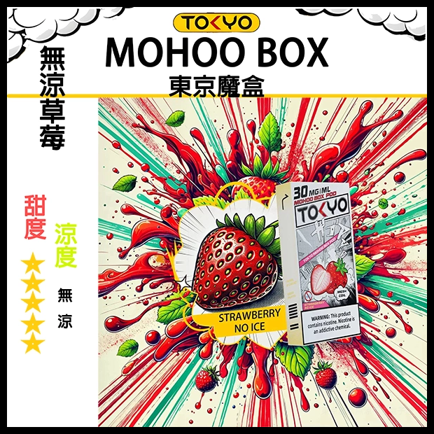 無涼草莓口味 東京魔盒電子煙彈这款新品魔盒煙彈,這是一種順滑且清新的電子菸液,專為那些渴望自然草莓風味而無需冰冷刺激的人設計。每一口都能帶來成熟草莓的甜美與酸味,完美平衡,為滿足您的電子菸體驗。